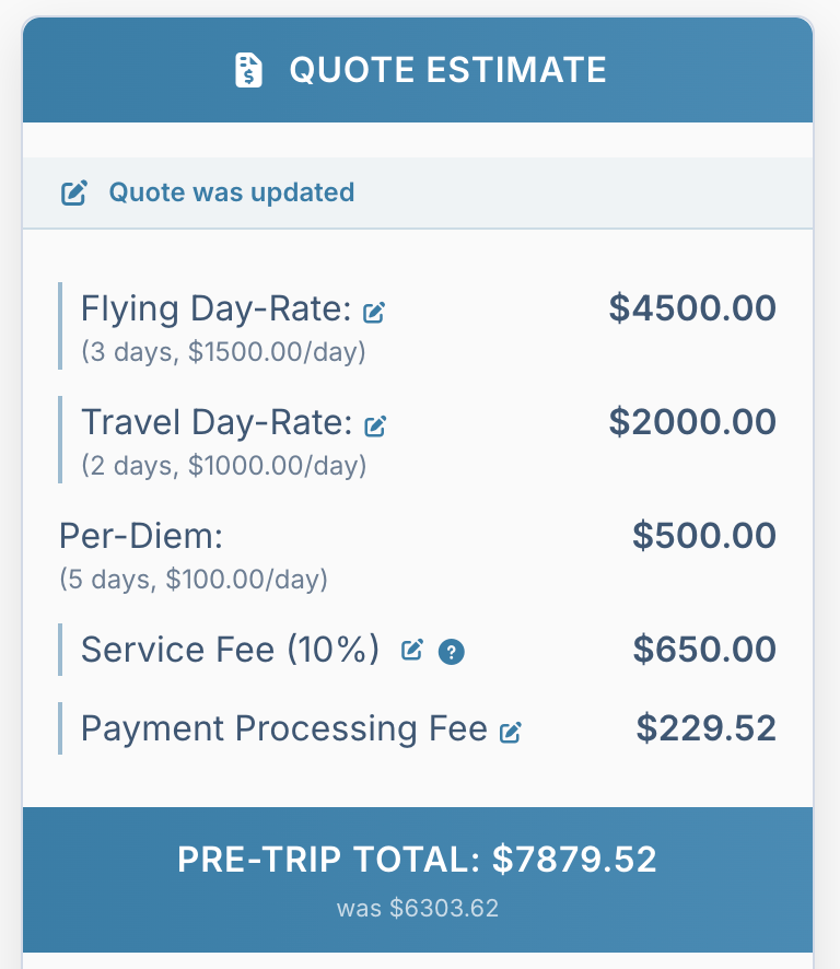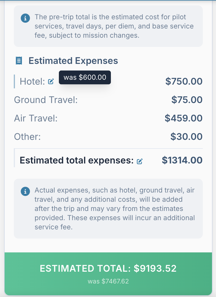 When a pilot submits a quote on Flying Company, almost everything about it can be updated. Day rate, travel day compensation, hotel estimates, ground travel, airfare, and any other expenses are all editable after submission.