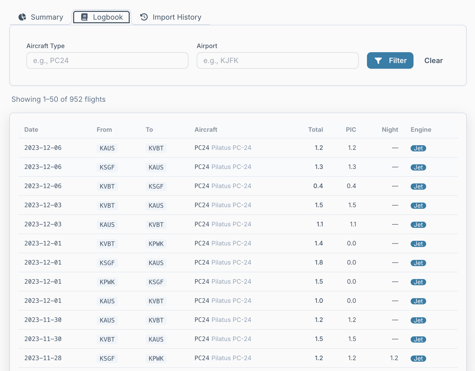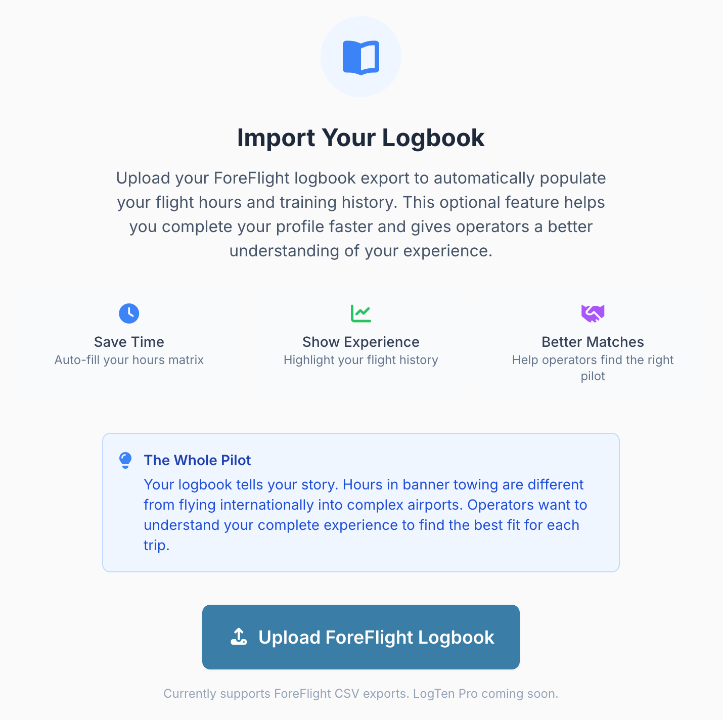 You can now export your ForeFlight logbook as a CSV, upload it, and have your hours calculated directly from your flight-by-flight record. Your Pilot History information lives in one place, always accessible and always current. Whether the trip is booked through Flying Company or not, you maintain a single, up-to-date record that you can download and share whenever needed.