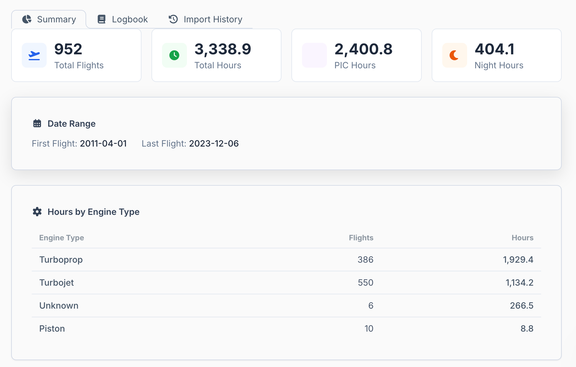 When you upload your ForeFlight logbook, Flying Company derives your totals from the flights themselves. Total time, PIC, turbine, multi-engine, night, instrument, and recency windows are calculated from actual logged entries.