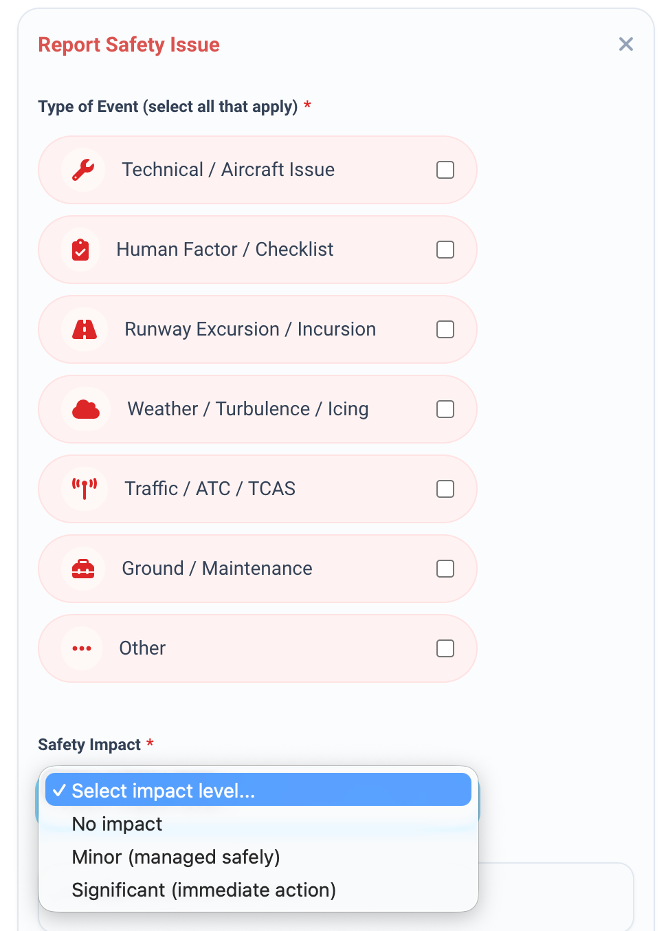 We focused on making the process intuitive without sacrificing the structure that safety teams expect. Pilots can describe the type of issue, provide context about flight conditions, and include any narrative details that help paint a clear picture. Most reports take well under a minute to complete.